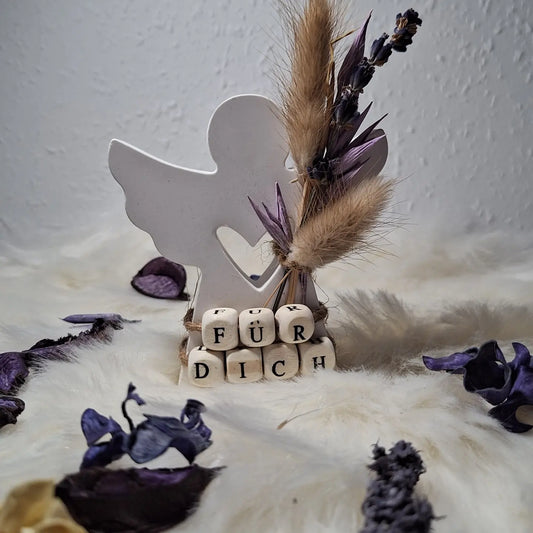 Handgefertigter Keraflott-Engel mit Herzöffnung, Holzperlen & „Für Dich“-Spruch – Dekorativer Schutzengel mit Trockenblumen