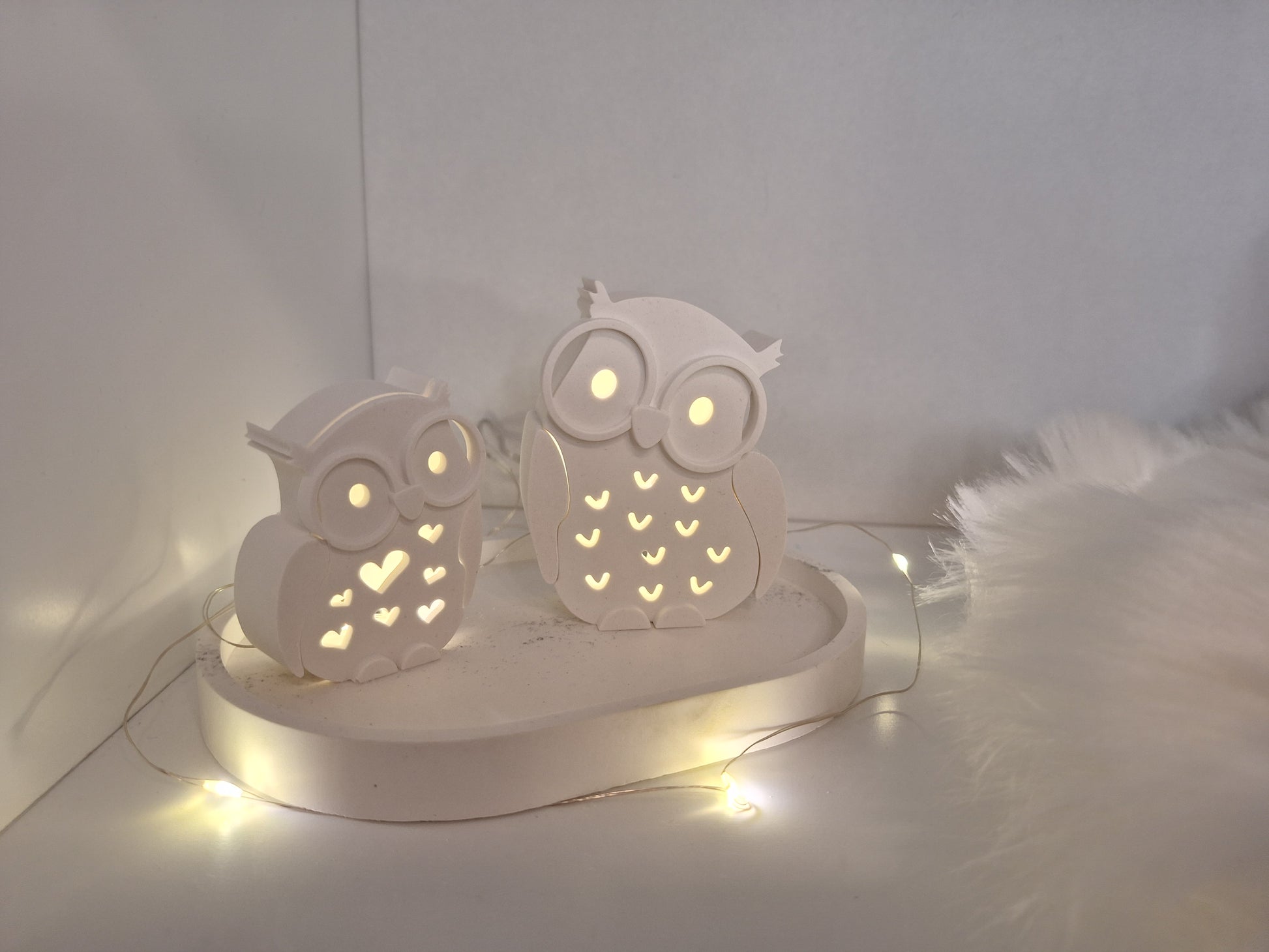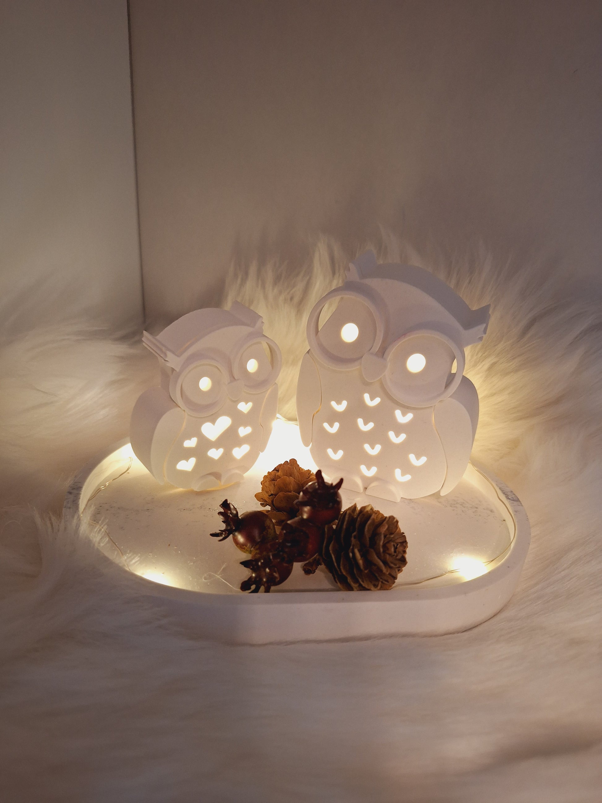 Keraflott gegossener Dekoteller-Set mit zwei Eulen und Innenlicht – oval, individuell dekorierbar, ganzjährig einsetzbar
