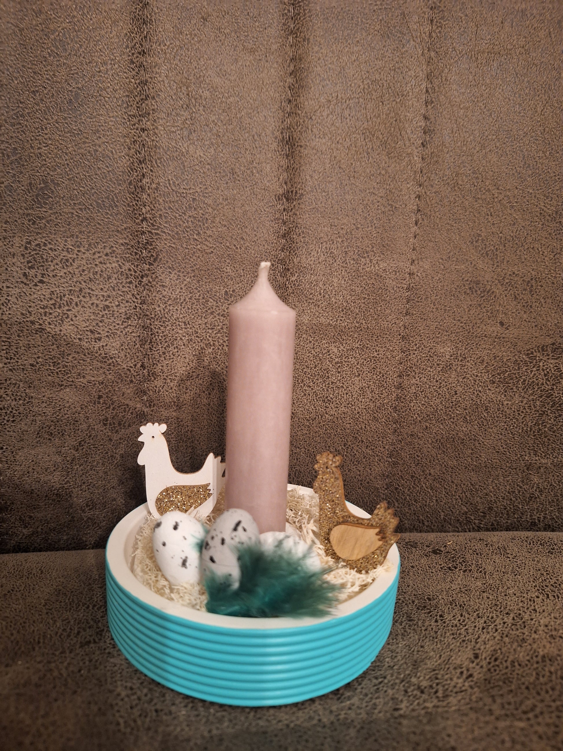 Verleihen Sie Ihrer Osterdekoration einen frischen und fröhlichen Akzent mit unserem wunderschönen Stabkerzenhalter in strahlendem Blau. Mit liebevoller Handarbeit wurde der Halter mit Acrylfarbe angestrichen, was ihm eine lebendige und moderne Optik verleiht. In der dekorativen Rille finden sich zarte Holzwolle sowie künstliche Deko-Eier aus Styropor und Holzdeko in formvollendeten Hühnern – perfekt, um Ihr Zuhause festlich und einladend zu gestalten. Ein bezauberndes Accessoire für die Osterzeit, das Freude und Fröhlichkeit in Ihre Dekoration bringt!